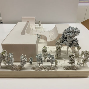 K náměstí přiléhá provoz kavárny a hlavního koncertního sálu, na klidnou severní stranu s výhledem na zahradu mateřské školy jsou orientovány učebny. Obě tyto základní hmoty propojuje prosklený otevřený krček foyer. V řešení školní části budovy jsme upřednostnili „dvojtrakt“ s otevřenou pavlačí a učebnami po severní straně. Toto řešení umožňuje vytvořit klidné intimní prostředí před samotnými učebnami, v přízemí pak možnost pro setkávání i díky pobytovým schodům s knihovnou, která může sloužit i jako místo setkání celé školy (promluva ředitele k žákům či učitelům apod.). Učebny využívají severní světlo, výtvarné třídy pak i střešní světlíky. Dle současných trendů se mezi učebnami uvažují akustické příčky pod mírným úhlem z důvodu lepší akustiky. Z jedné z pavlačí je možné se dostat na pobytovou střechu s možností venkovní výuky. Z jižní strany je pavlačová část zakončena stěnou, která umožní průběžně vystavovat výtvarné práce žáků, pořádat výstavy apod. Největší učebny a sály na konci pavlačí jsou orientované na jih, na výhled na skupinu vzrostlých stromů, které poskytnou potřebný stín (ověřeno na místě s paní ředitelkou stávající speciální školy). Tyto sály jsou uvažovány jako chlazené a větrané (bude ověřeno ve vyšším stupni projektové dokumentace). Foyer je otevřené, prosklené, se zázemím šatny, toalet a přístupu do podzemní garáže. Na foyer navazuje kavárna a hlavní koncertní sál se zázemím. Z foyer je také vstup do pobytové zahrady školy, kde jsou umístěny venkovní schody na střešní pobytovou terasu s možností venkovních koncertů či letního kina.